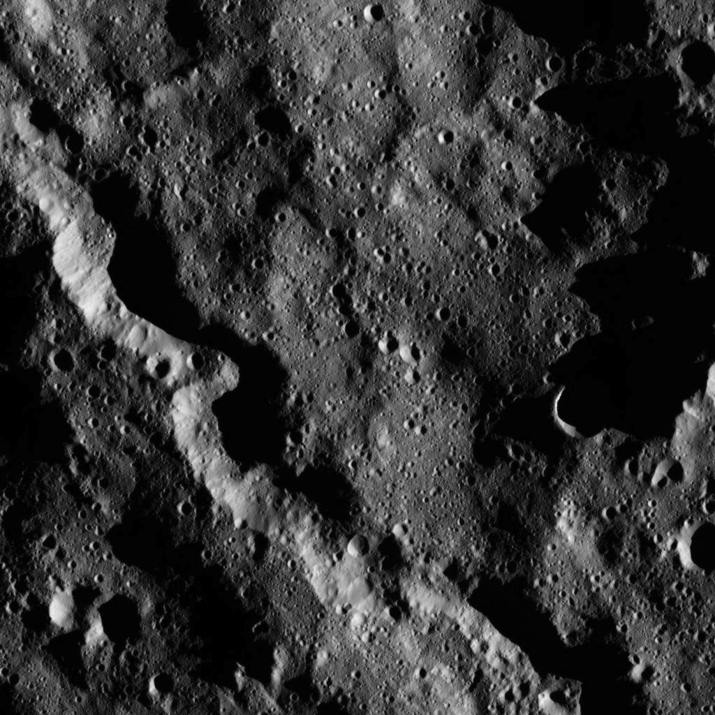 This moody scene from NASA's Dawn spacecraft captures a portion of the southern hemisphere of Ceres. The image is centered at approximately 64 degrees south latitude, 291 degrees east longitude.