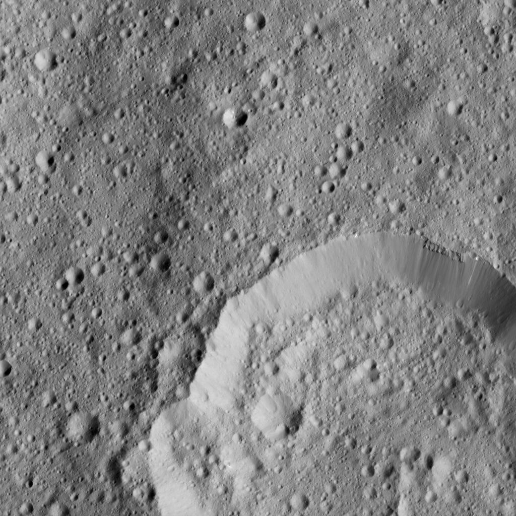 Dawn took this image on June 6, 2016, from its low-altitude mapping orbit, at a distance of about 240 miles (385 kilometers) above the surface. The image resolution is 120 feet (35 meters) per pixel.