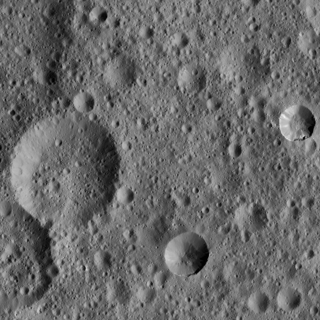 This picture shows two relatively fresh craters (at center right and bottom center) within older, highly cratered terrain on Ceres. The young crater at right shows some spurs of compacted material along its rim, as well as some bright streaks along its flanks.