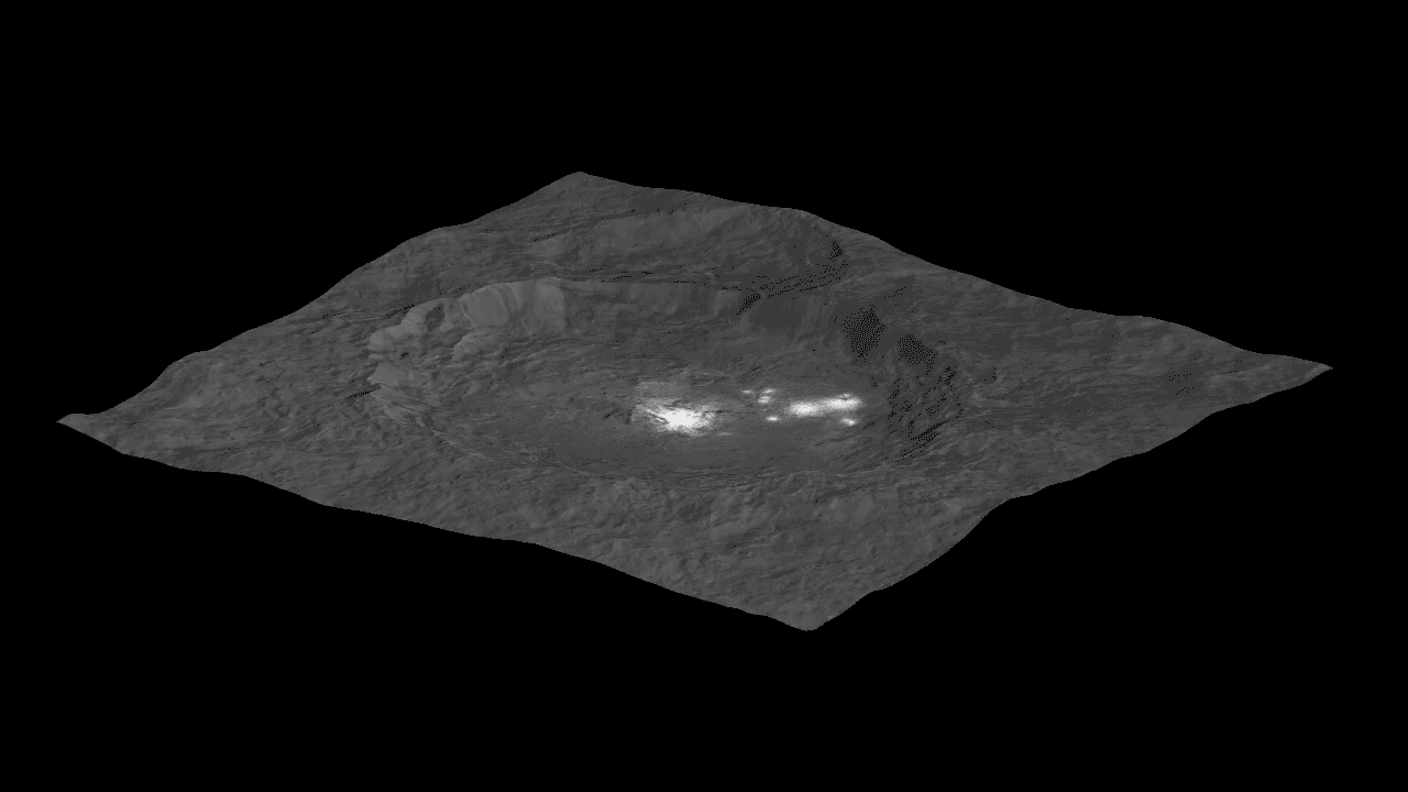 The bright spots are much brighter than the rest of Ceres' surface, and tend to appear overexposed in most images. This view is a composite of two images of Occator: one using a short exposure that captures the detail in the bright spots, and one where the background surface is captured at normal exposure.