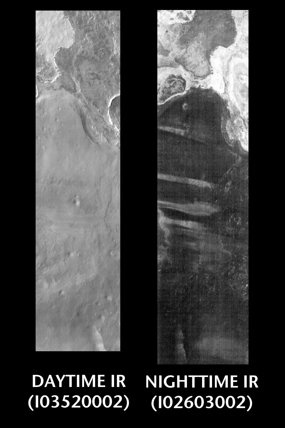 Nighttime:Infrared images taken during the nighttime exhibit only the thermophysical properties of the surface of Mars. The effect of sun-facing versus non-sun-facing energy dissipates quickly at night. Thermophysical effects dominate as different surfaces cool at different rates through the nighttime hours. Rocks cool slowly, and are therefore relatively bright at night (remember that rocks are dark during the day). Dust and other fine grained materials cool very quickly and are dark in nighttime infrared images.