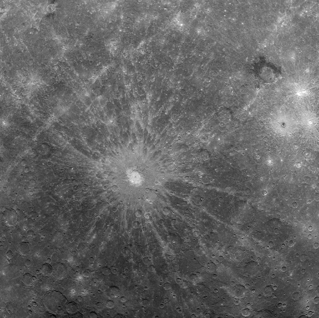 This image was taken with MESSENGER's Wide Angle Camera (WAC) using the 997-nm filter, one of the 12 filters available for use with the WAC. The WAC is a refracting telescope with a focal length of 78 mm, a field of view of 10.5°, and a collecting area (entrance pupil aperture) of 48 mm2. The detector located on the focal plane is a 1024 x 1024 pixel (1 megapixel) CCD. The filters, which reside on a rotating wheel, range in wavelength from 430 nm to 1040 nm (visible through near-infrared) and include a broadband filter for optical navigation imaging of stars.