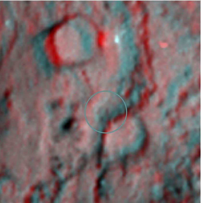 Red/blue 3-D glasses are required to view this image (the red filter should be over the left eye). Disturbances to the impact site located at the center of the image are subtle.