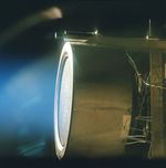 This image of a xenon ion engine prototype, photographed through a port of the vacuum chamber where it was being tested at NASA's Jet Propulsion Laboratory, shows the faint blue glow of charged atoms being emitted from the engine. The engine is now in an ongoing extended- life test, in a vacuum test chamber at JPL, and has run for almost 500 days (12,000 hours) and is scheduled to complete nearly 625 days (15,000 hours) by the end of 2001.