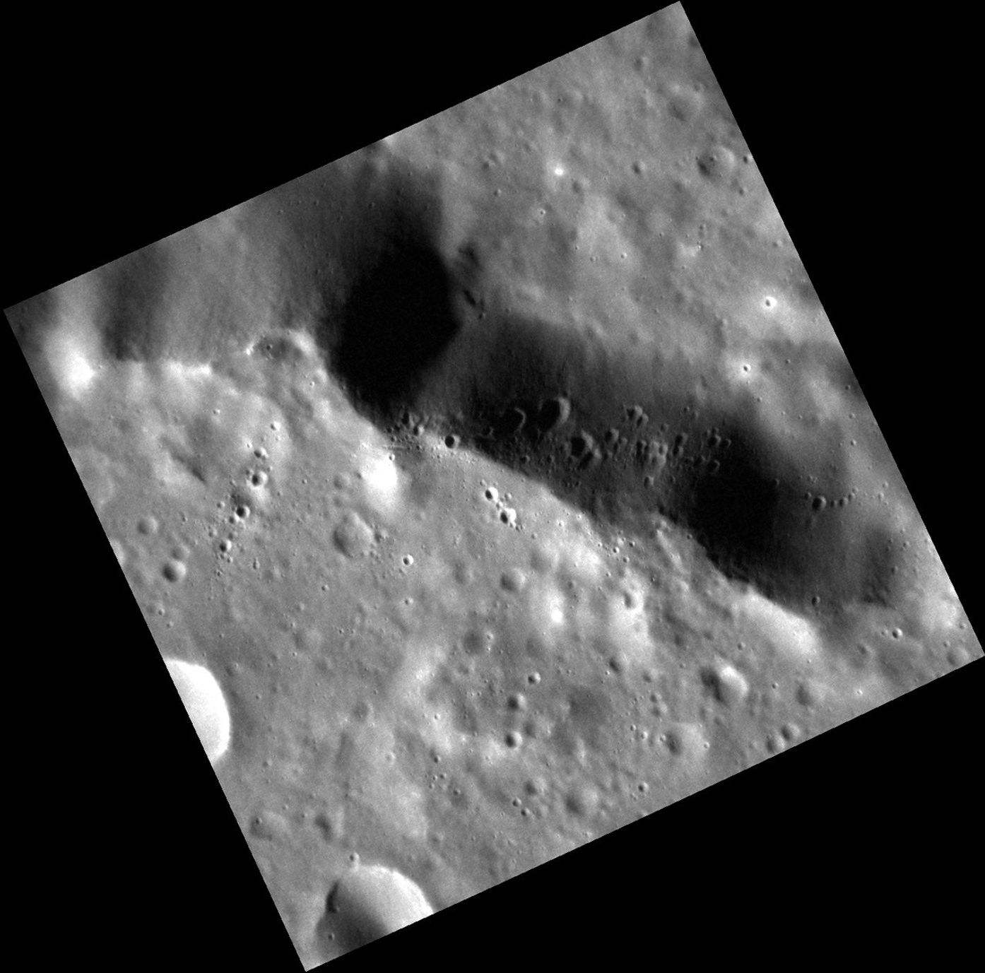 The rim of an unnamed peak-ring basin cuts across today's featured image. The basin is relatively degraded, but its rim still stands as a cliff over 1 km (0.6 miles) high. The face of this cliff, where downslope is toward the top of the image, is covered by a chain of secondary craters, whose formation on this steep slope led to somewhat asymmetrical crater shapes. It's hard to say which crater these secondaries originated from - the region is crossed by rays from Bronte, over 1700 km to the west, and Hokusai, over 2000 km to the east.