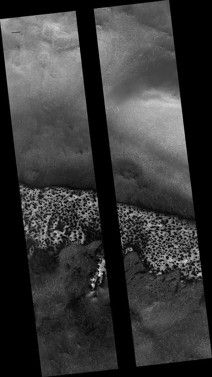 This image shows a field of sand dunes in the Martian springtime while the seasonal carbon dioxide frost is sublimating into the air. This sublimation process is not at all uniform, instead creating a pattern of dark spots.