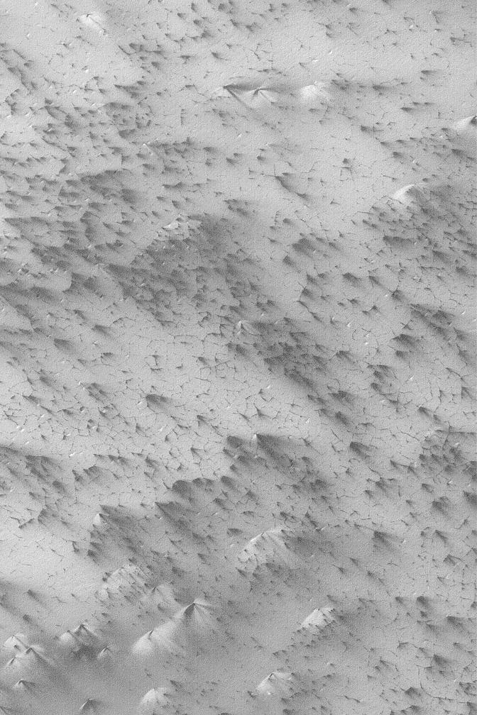 This June 2003 Mars Global Surveyor (MGS) Mars Orbiter Camera (MOC) picture shows patterns created by defrosting processes on the south polar seasonal ice cap. Seasonal cap refers to the part of the polar cap that comes and goes with the seasons, as opposed to the residual cap, which lasts throughout the summer. The area shown here, in summer, will have no frost. This picture was taken during southern spring. As the seasonal frost begins to sublime away, dark cracks form a polygon pattern, and wind blows material to form varied bright and dark streaks. What is unknown is whether the dark streaks consist of sand and silt from beneath the seasonal frost, or whether they, too, consist of frost that has been transformed into coarse-grained particles that can be mobilized by wind. Alternatively, the streaks represent erosion and removal of frost, rather than deposition of granular material. The bright streaks are most likely made of frost--whether they are water ice or carbon dioxide ice remains to be determined. The bulk of the frosted surface shown here is carbon dioxide ice. The image is located near 87.3°S, 192.4°W. The picture covers an area 3 km (1.9 mi) wide and is illuminated by sunlight from the upper left.