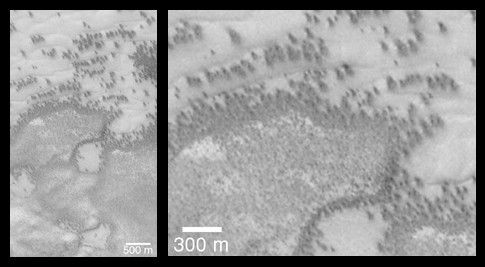 "They look like bushes!" That's what almost everyone says when they see the dark features found in pictures taken of sand dunes in the polar regions as they are beginning to defrost after a long, cold winter. It is hard to escape the fact that, at first glance, these images acquired by the Mars Global Surveyor (MGS) Mars Orbiter Camera (MOC) over both polar regions during the spring and summer seasons, do indeed resemble aerial photographs of sand dune fields on Earth -- complete with vegetation growing on and around them! Of course, this is not what the features are, as we describe below and in related picture captions. Still, don't they look like vegetation to you? Shown here are two views of the same MGS MOC image. On the left is the full scene, on the right is an expanded view of a portion of the scene on the left. The bright, smooth surfaces that are dotted with occasional, nearly triangular dark spots are sand dunes covered by winter frost.