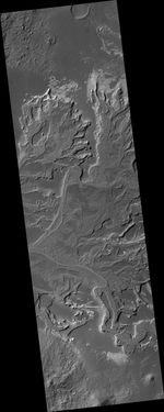 This HiRISE image covers a portion of a delta that partially fills Eberswalde crater in Margaritifer Sinus. The delta was first recognized and mapped using MOC images that revealed various features whose presence required sustained flow and deposition into a lake that once occupied the crater. The HiRISE image resolves meter-scale features that record the migration of channels and delta distributaries as the delta grew over time. Differences in grain-size of sediments within the environments on the delta enable differential erosion of the deposits. As a result, coarser channel deposits are slightly more resistant and stand in relief relative to finer-grained over-bank and more easily eroded distal delta deposits. Close examination of the relict channel deposits confirms the presence of some meter-size blocks that were likely too coarse to have been transported by water flowing within the channels. These blocks may be formed of the sand and gravel that more likely moved along the channels that was lithified and eroded. Numerous meter-scale polygonal structures are common on many surfaces, but mostly those associated with more quiescent depositional environments removed from the channels. The polygons could be the result of deposition of fine-grained sediments that were either exposed and desiccated (dried out), rich in clays that shrunk when the water was removed, turned into rock and then fractured and eroded, or some combination of these processes.