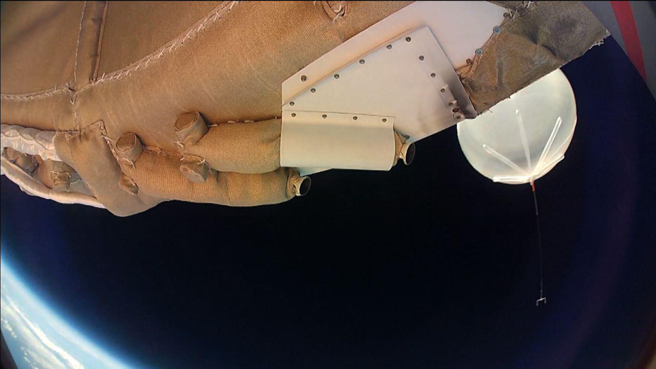 Moments into its powered flight, the LDSD test vehicle captured this image of the balloon which carried it to high altitudes. The image was taken by one of the saucer-shaped test vehicle's high-resolution cameras. On June 28, 2014, a balloon lifted the 7,000-pound saucer-shaped vehicle to an altitude of 119,000 feet (36,270 meters), then a rocket boosted it even higher, where tests of Martian landing technologies began.