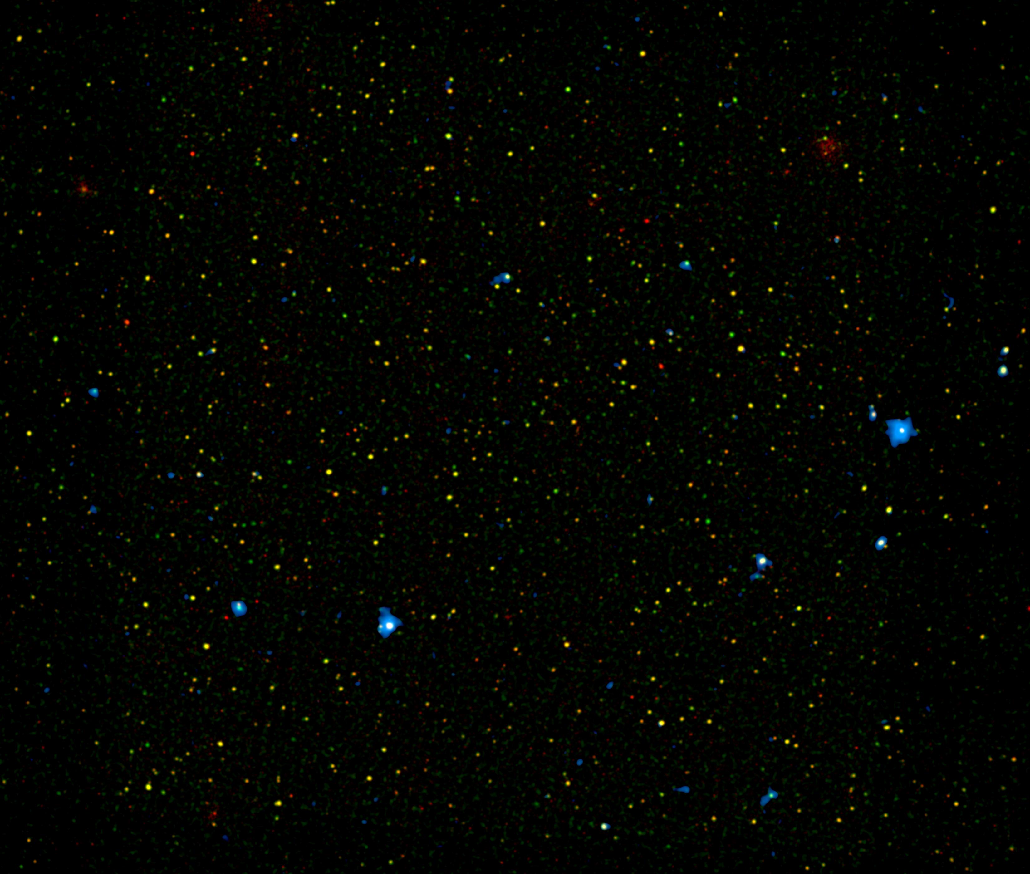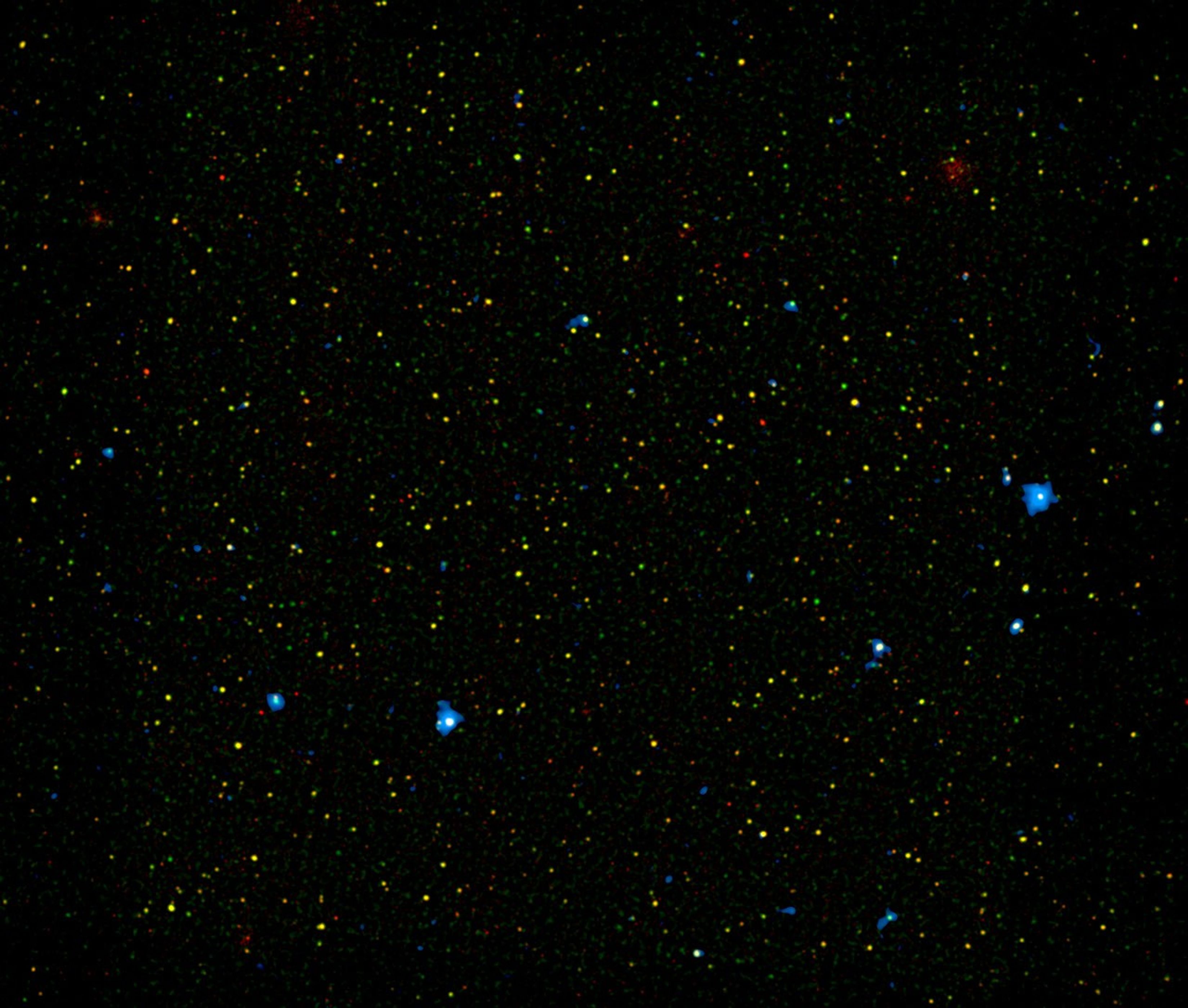 The image shows an area, called the COSMOS field, that has been studied in great detail by many telescopes (COSMOS stands for Cosmic Evolution Survey). Red and green represent X-ray light seen by Chandra with energies of 0.5 to 2 kiloelectron volts (keV), and 2 to 7 keV, respectively. Blue is 8 to 24 keV, which can only be seen by NuSTAR.