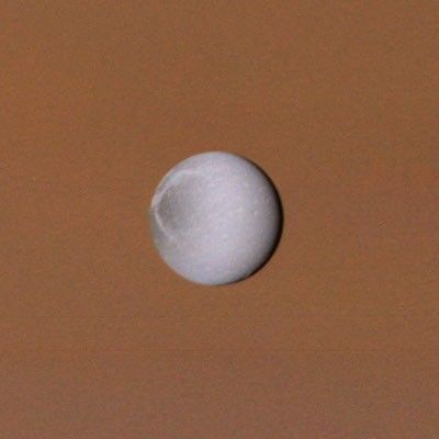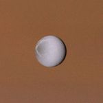 Dione, seen here against the disk of Saturn, is a bright, white, icy object like the other inner satellites. There is a difference in character between its leading and trailing hemispheres; the trailing side, seen on the left in this image, shows a pattern of bright wispy streaks against a darker background.