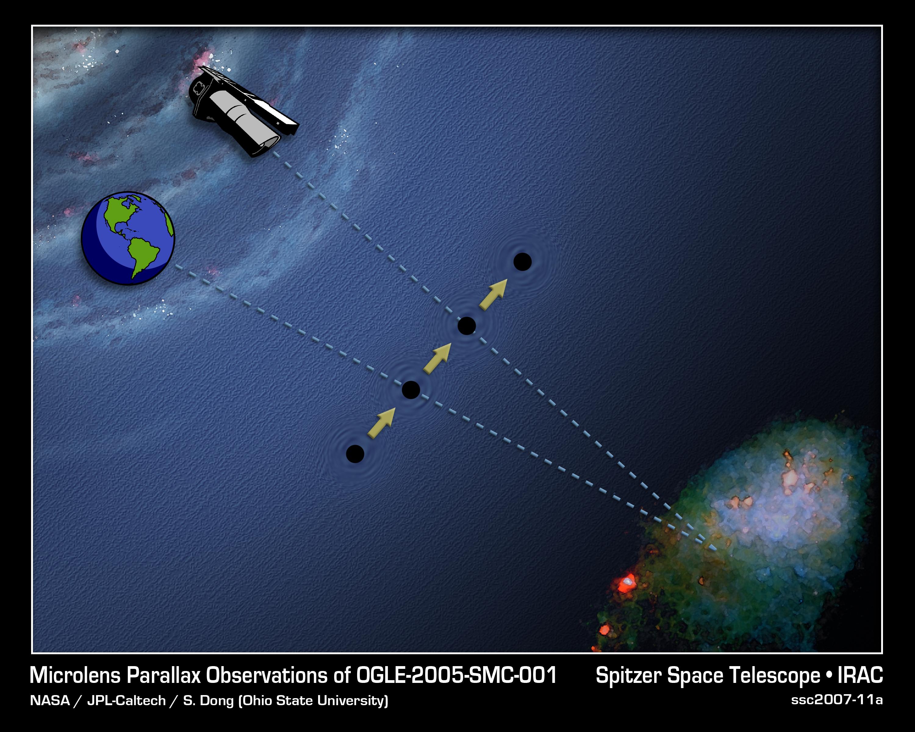 To determine OGLE-2005-SMC-001's distance, astronomers measured the microlensing event over several months with both Spitzer in space and the Earth-based telescopes. Careful analysis of the data revealed the time of the peak brightness differed slightly between the two locations.