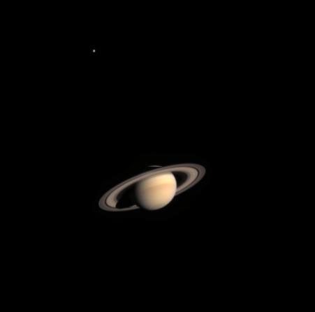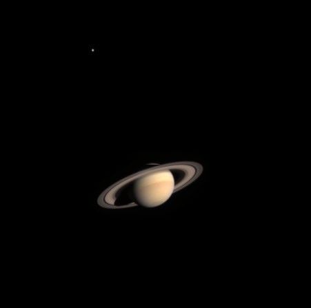 Titan, Saturn's largest moon, appears in the upper left. It is the only moon resolved from this distance. This composite uses a threefold enhancement in the brightness of Titan relative to the brightness of Saturn. Titan is a major attraction for scientists of the Cassini-Huygens mission. They will study its haze-enshrouded atmosphere and peer down, with special instrumentation, to its surface to look for evidence of organic processes similar to those that might have occurred on the early Earth, prior to the emergence of life.