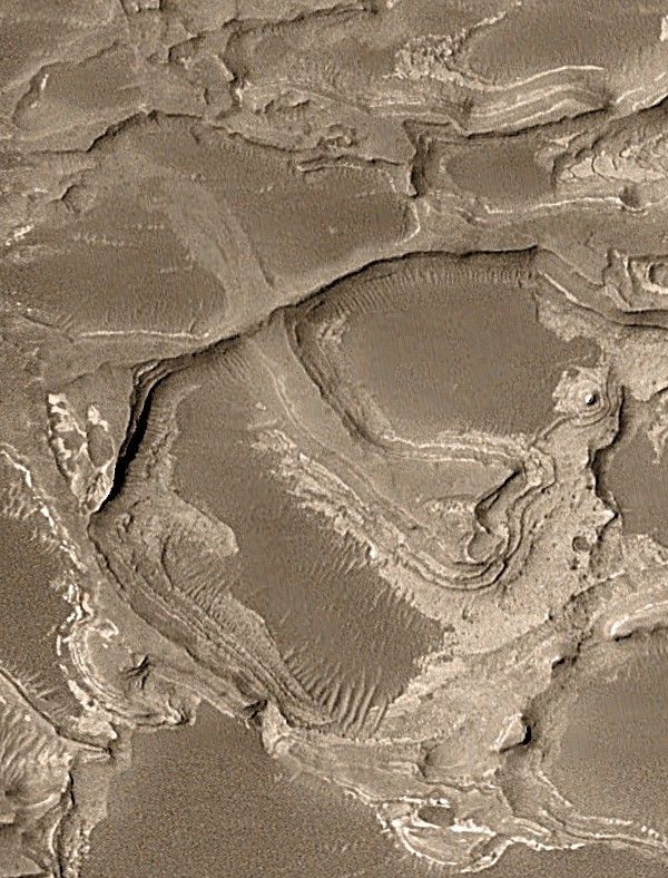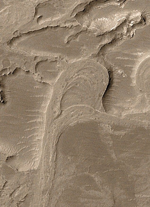 A region near the center of the fan has a loop, the inverted floor of a former meandering stream that was cut off as the channel adjusted its course. Meanders and cut-off meanders are the prime evidence for persistent flow of water through this area sometime early in martian history.