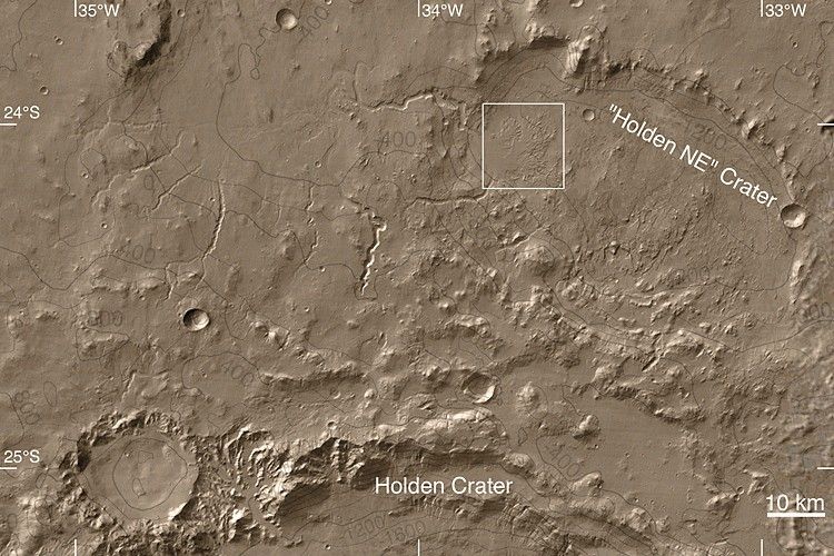 A regional context image shows the location of the fan with a white box. West of the fan are several valleys that fed water and sediment to the crater holding the fan (labeled "Holden NE" Crater). This map is a mosaic of daytime infrared images from the Thermal Emission Imaging System on Mars Odyssey. The contours are topography relative to Mars' zero-elevation level, derived from observations by the Mars Orbiter Laser Altimeter on Mars Global Surveyor. Sunlight illuminates the scene from the upper left. The 10-kilometer scale bar is about 6.2 miles across.