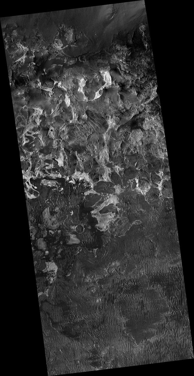 This scene includes chaotic deposits with a wide range of colors. The deposits are distinctive with both unique colors and small-scale textures such as fracture patterns.
