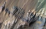 In an enhanced color image, the varying colors – shades of white, cyan, and purple – are suggestive of multiple minerals being present within the bedrock, indicating a complicated geologic history, possibly involving alteration by water. (In this cutout, north is down.)