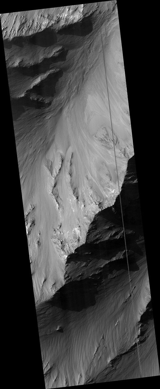 This image shows the southern wall of Coprates Chasma, in the equatorial canyon system of Valles Marineris. While much of the lower slopes are covered by sand, exposed bedrock is clearly visible in the upper canyon walls.