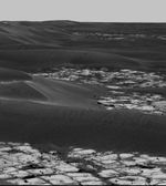 This image taken by NASA's Mars Exploration Rover Opportunity is a portion of a mosaic acquired by the panoramic camera. The picture highlights the light-toned outcrop on the rim of "Erebus Crater" and large, dark, wind-deposited drifts that have filled the center of the crater. Opportunity took this image on the rover's 608th sol (Oct. 9, 2005). The rover is driving west, avoiding the large drifts and crossing the low ripples and outcrop to the right. After traversing to the north of the large drift on the horizon (near the center of the image), Opportunity will drive south to the western rim of the crater.