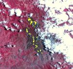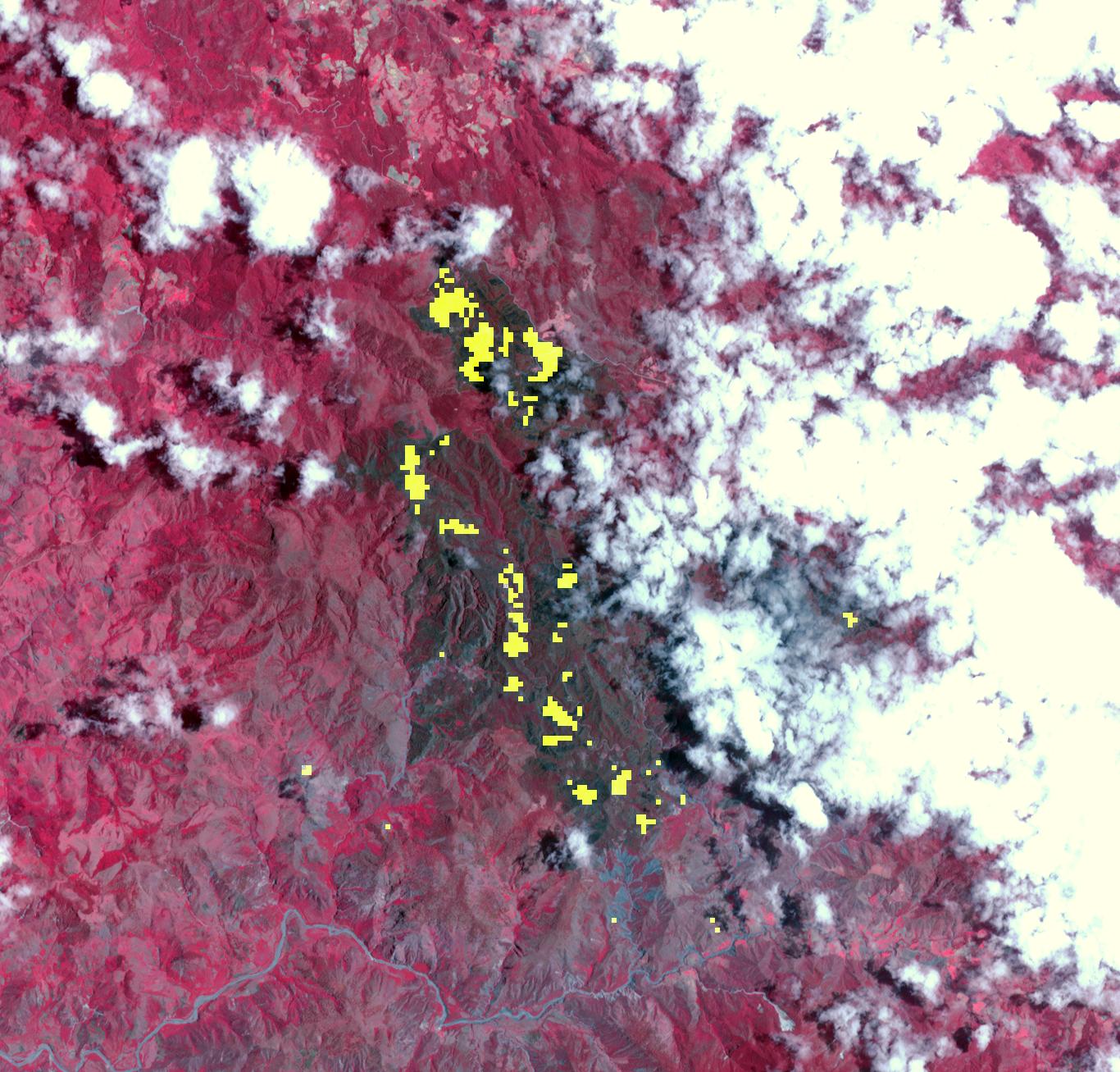 The spread of the forest fire in Valle Nuevo National Park near Costanza, Dominican Republic that started nearly two weeks ago was considerably contained by Aug. 5, 2014, according to the Environment Ministry. An appeal by the Dominican government to the United States for assistance was answered with funds and equipment. The Advanced Spaceborne Thermal Emission and Reflection Radiometer (ASTER) instrument on NASA's Terra spacecraft captured this thermal infrared view of the region on Aug. 5, 2014. Active hot spots of the fire are shown in yellow, healthy vegetation is depicted in red, and the burned areas are dark gray. The image is located at 18.8 degrees north, 70.7 degrees west, and covers an area of 12.1 by 12.7 miles (19.5 by 20.4 kilometers).