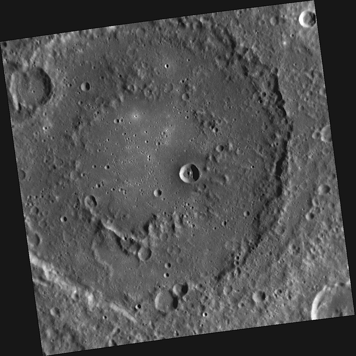 This image, taken by the Narrow Angle Camera (NAC), shows the double rings of an unnamed peak-ring basin. Concentric ring structures like these form during the impact that creates a basin; the number and characteristics of the rings depend on the size of the impact structure and the gravity of the planet.