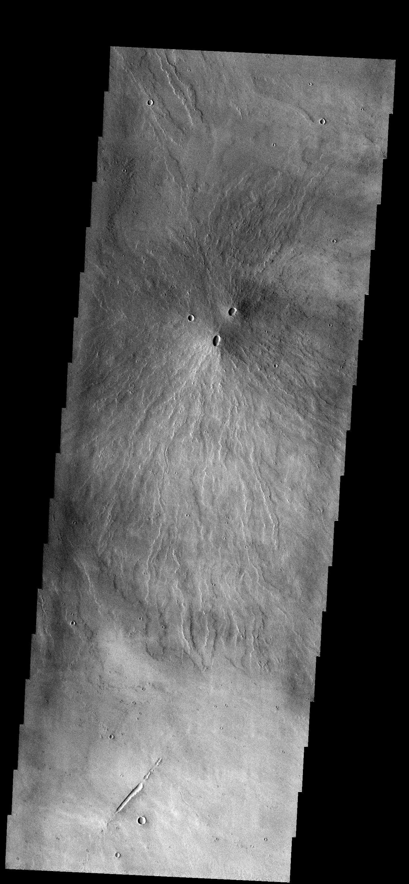 Two volcanic vents have erupted material to form this small volcano just south of Pavonis Mons.