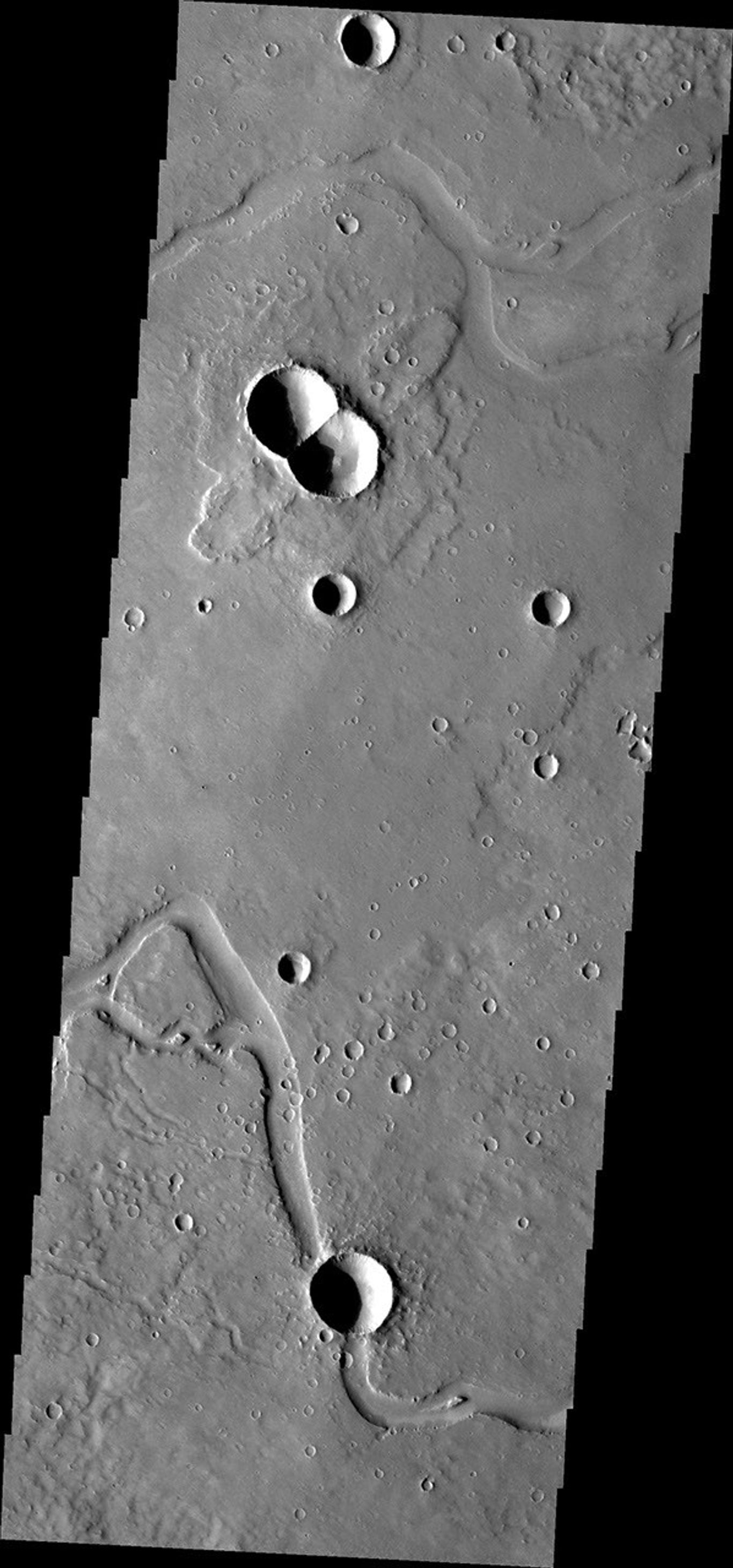 This doublet crater is located in Utopia Planitia, near the Elysium Volcanic region. Doublet craters are formed by simultaneous impact of a meteor that broke into two pieces prior to hitting the surface. The channels in the image are part of Granicus Valles.