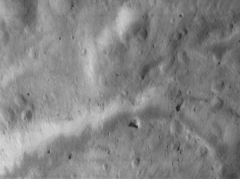 Even the earliest, low-resolution images of Eros from NEAR Shoemaker show a variety of bright patches and bands on crater walls and other steep slopes. This picture, taken June 16, 2000, from an orbital altitude of 50 kilometers (31 miles), captures bright patches in two different environments. The crater in the top center of the picture has a bright patch on one of its walls, whereas the low, curved escarpment that snakes along the bottom of the image has bright material exposed along its length. The bright patches are a source of speculation, but they may have originated from exposure of subsurface material. The whole scene is approximately 1.9 kilometers (1.2 miles) across.