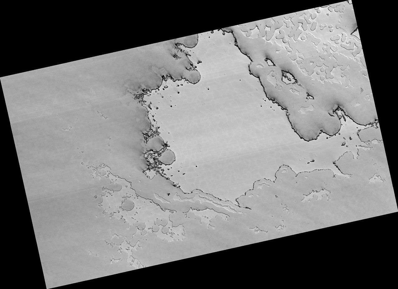 The south polar residual cap of carbon dioxide ice rapidly changes. This image was planned as an almost exact match to the illumination and viewing angles of a previous one we took in August 2009.