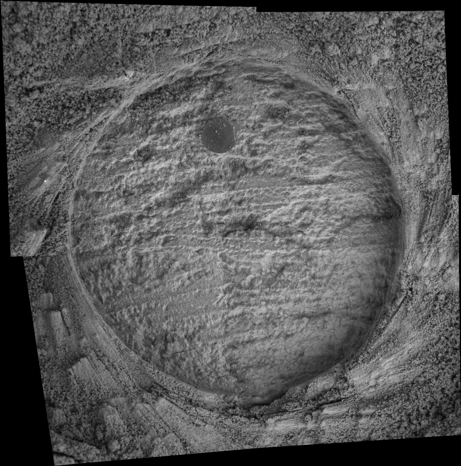This image taken by the Mars Exploration Rover Opportunity shows a target dubbed "Drammensfjorden" on a rock called "Millstone" in "Endurance Crater." Opportunity dug a hole into the target with its rock abrasion tool, then captured this picture with its microscopic imager on sol 162 (July 8, 2004). The image mosaic is about 6 centimeters (2.4 inches) across.