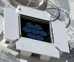 Figure A is a close-up of the optical terminal, which consists of seven segmented hexagonal mirrors that mimic the light-collecting aperture of a 3.3-foot (1-meter) telescope. As the laser photons arrive at the antenna, each mirror reflects the photons and precisely redirects them into a high-exposure camera attached to the antenna's subreflector, which is suspended above the center of the dish.