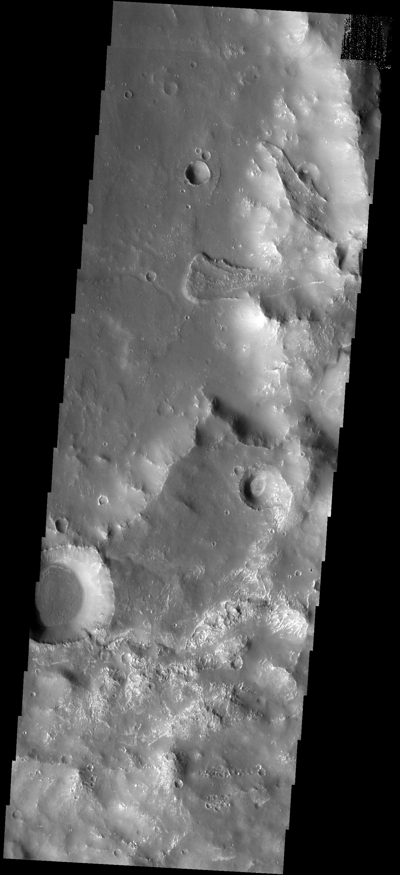 Note: this THEMIS visual image has not been radiometrically nor geometrically calibrated for this preliminary release. An empirical correction has been performed to remove instrumental effects. A linear shift has been applied in the cross-track and down-track direction to approximate spacecraft and planetary motion. Fully calibrated and geometrically projected images will be released through the Planetary Data System in accordance with Project policies at a later time.