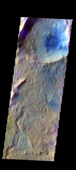 The THEMIS VIS camera contains 5 filters. The data from different filters can be combined in multiple ways to create a false color image. These false color images may reveal subtle variations of the surface not easily identified in a single band image. Today's false color image shows the dunes on the floor of Dulovo Crater.