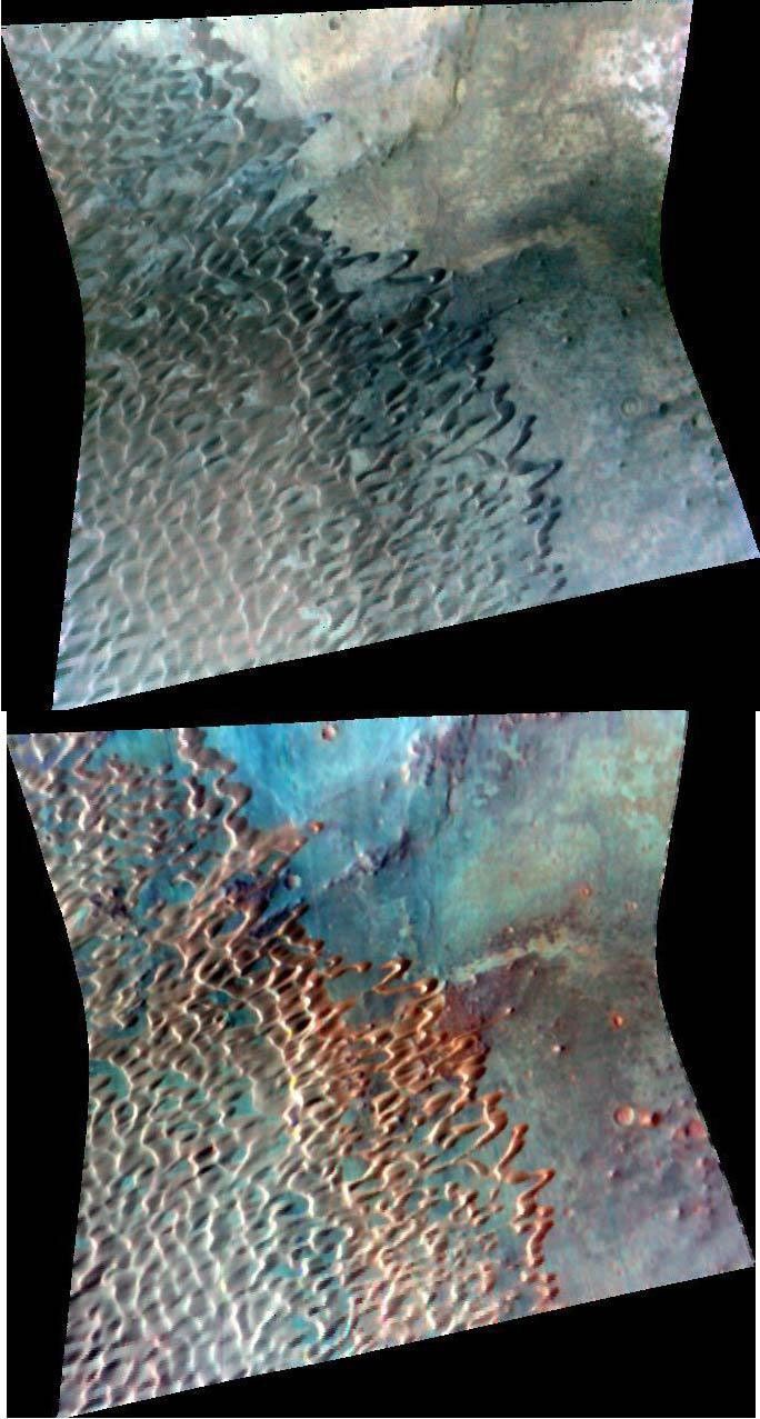 The Compact Reconnaissance Imaging Spectrometer for Mars (CRISM) took this image of the southeastern edge of a large dune field within Nili Patera, an irregularly shaped volcanic caldera that is about 65 kilometers (40 miles) in diameter. The image was acquired at 1333 UTC (8:33 a.m. EST) on Feb. 1, 2007, near 8.8 degrees north latitude, 67.3 degrees east longitude. CRISM's image was taken in 544 colors covering 0.36-3.92 micrometers, and shows features as small as 20 meters (66 feet) across. The region covered by the image is just over 10 kilometers (6 miles) wide at its narrowest point.