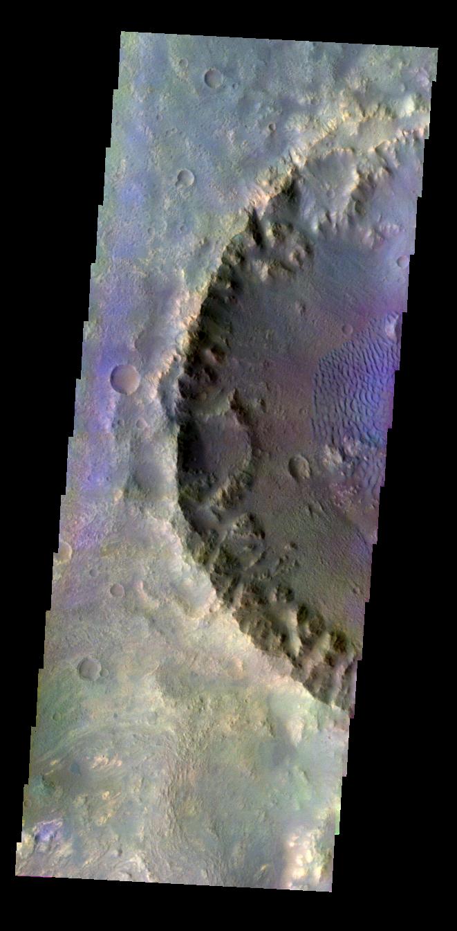 This daytime visible color image was collected on October 16, 2003 during the Southern Summer season of a crater within Molesworth Crater.This daytime visible color image was collected on September 4, 2002 during the Northern Spring season in Vastitas Borealis. The THEMIS VIS camera is capable of capturing color images of the martian surface using its five different color filters. In this mode of operation, the spatial resolution and coverage of the image must be reduced to accommodate the additional data volume produced from the use of multiple filters. To make a color image, three of the five filter images (each in grayscale) are selected. Each is contrast enhanced and then converted to a red, green, or blue intensity image. These three images are then combined to produce a full color, single image. Because the THEMIS color filters don't span the full range of colors seen by the human eye, a color THEMIS image does not represent true color. Also, because each single-filter image is contrast enhanced before inclusion in the three-color image, the apparent color variation of the scene is exaggerated. Nevertheless, the color variation that does appear is representative of some change in color, however subtle, in the actual scene. Note that the long edges of THEMIS color images typically contain color artifacts that do not represent surface variation.