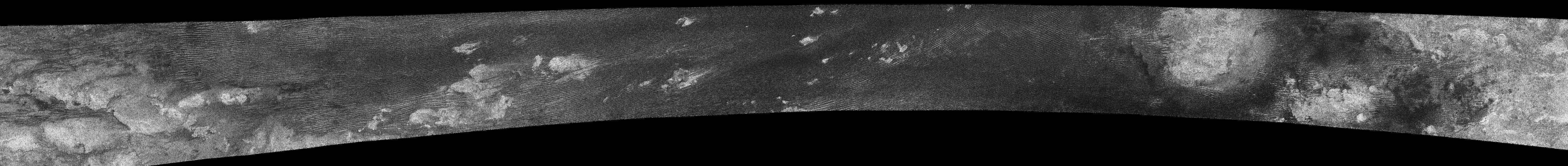 The most ubiquitous features in this swath are "cat scratches," which are interpreted as longitudinal dunes and were first seen in the February 2005 flyby, see PIA03555.