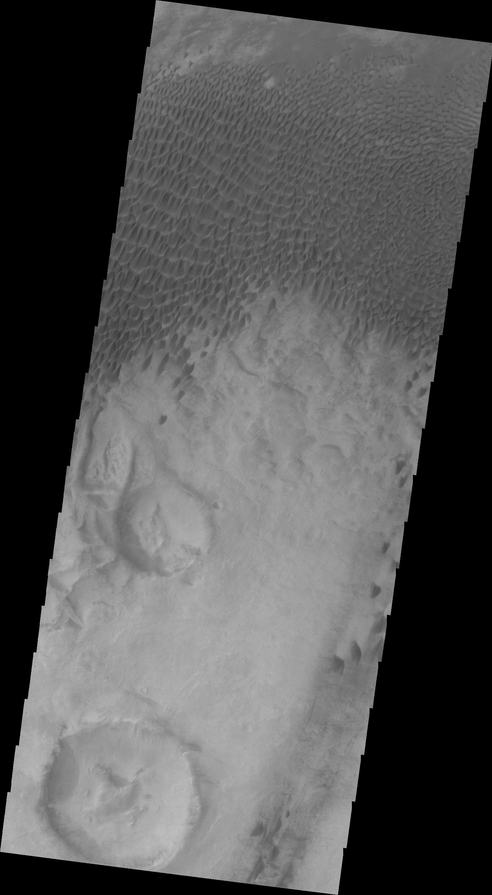 Note: this THEMIS visual image has not been radiometrically nor geometrically calibrated for this preliminary release. An empirical correction has been performed to remove instrumental effects. A linear shift has been applied in the cross-track and down-track direction to approximate spacecraft and planetary motion. Fully calibrated and geometrically projected images will be released through the Planetary Data System in accordance with Project policies at a later time.