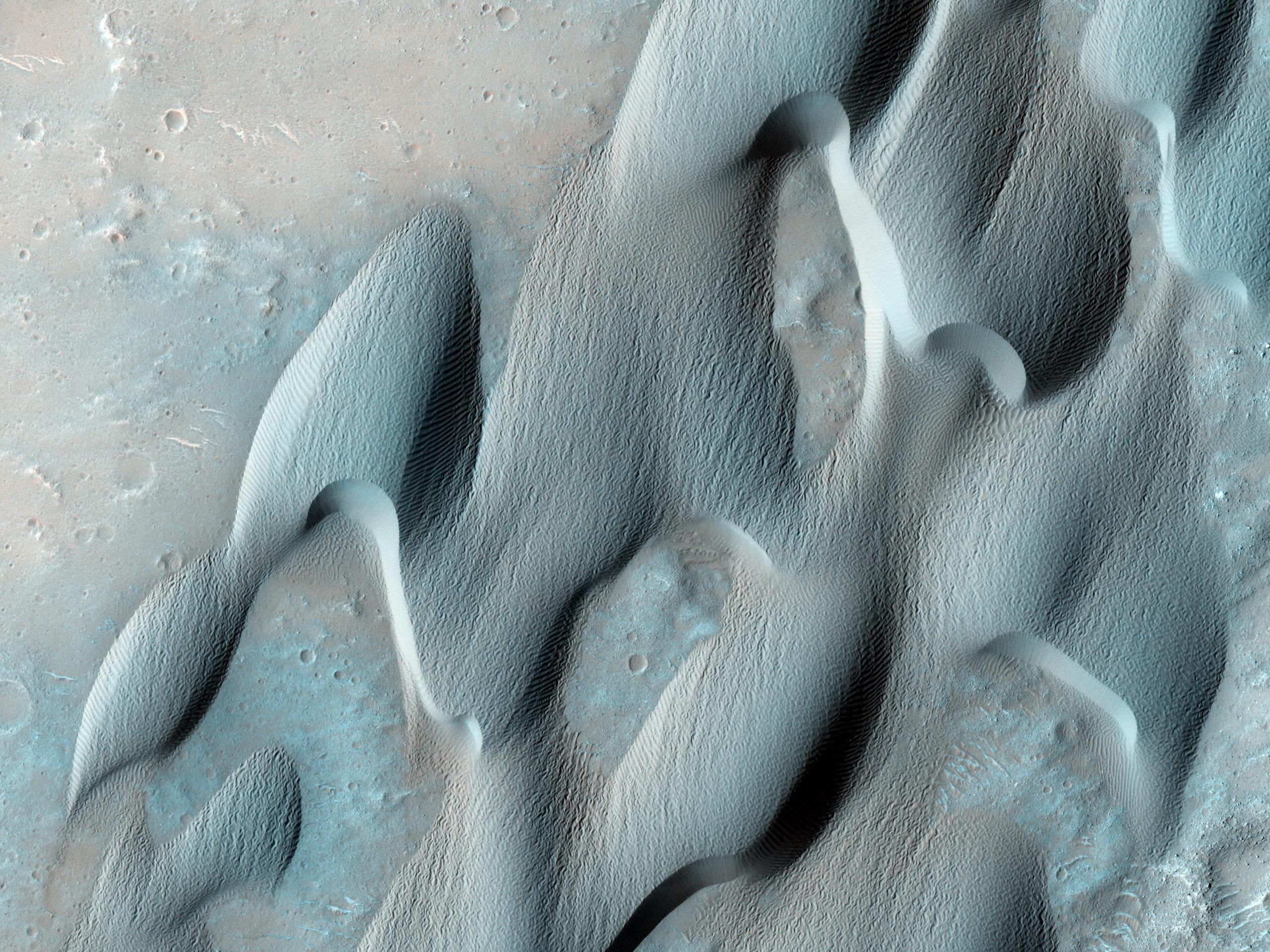 This image from NASA's Mars Reconnaissance Orbiter shows dunes on the floor of Herschel Crater. Steep faces ('slipfaces') are oriented downwind, in the direction of motion of the dunes. A dune-free area downwind of the crater is seen at the image center.