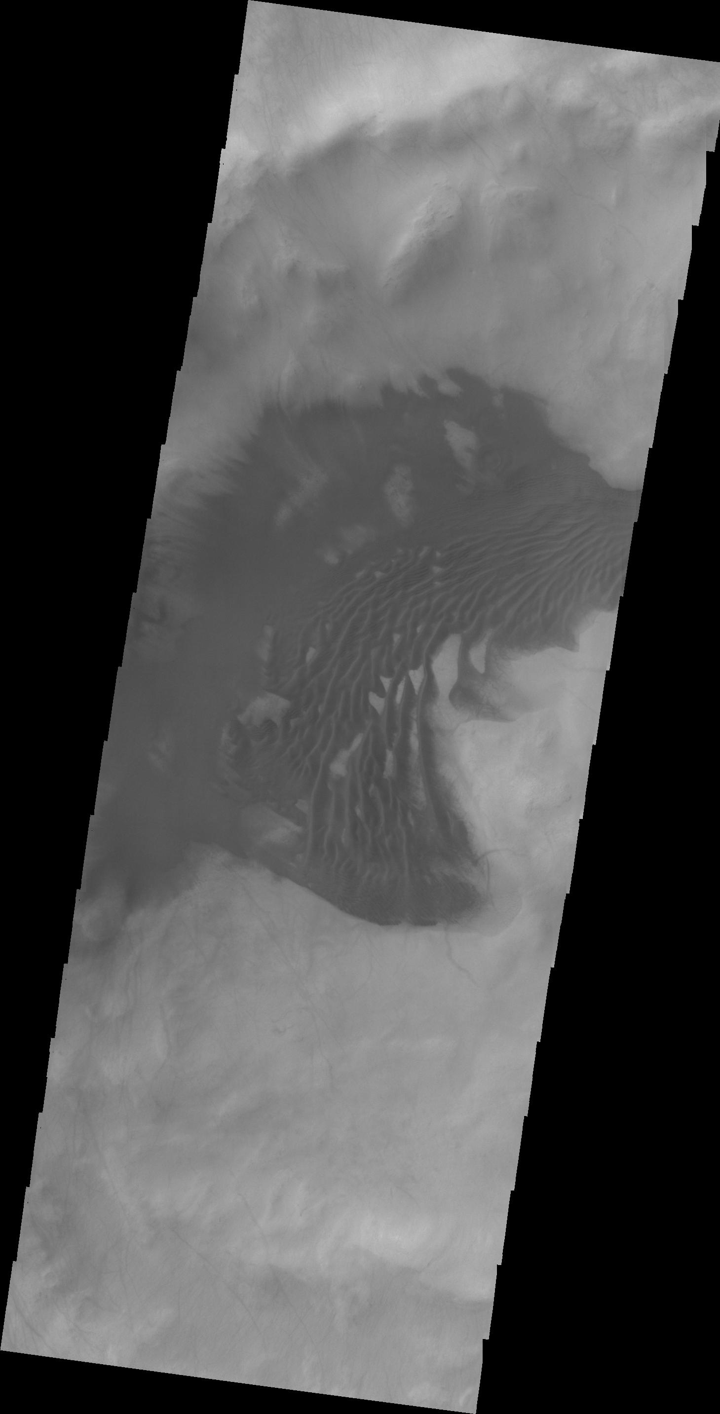 The dunes in today's VIS image are located in an unnamed crater in Sisyphi Planum.