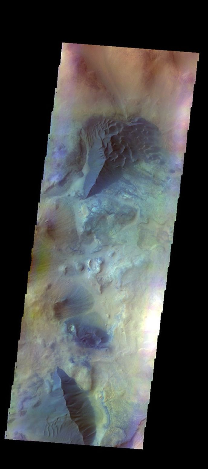 The THEMIS VIS camera contains 5 filters. The data from different filters can be combined in multiple ways to create a false color image. These false color images may reveal subtle variations of the surface not easily identified in a single band image. Today's false color image shows several areas of dunes and sand sheets with dune forms between the numerous hills in this region west of Argyre Planitia. Basaltic sand appears dark blue in this false color image.
