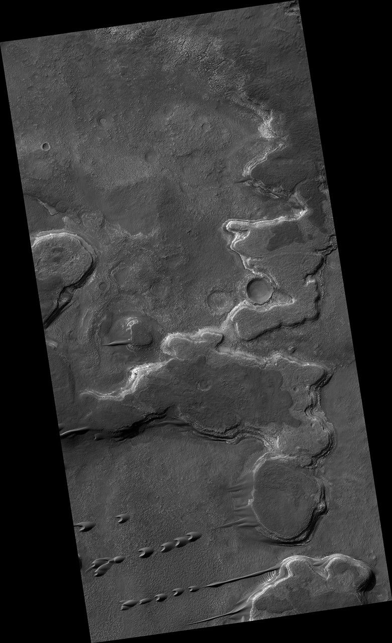 These barchan dunes are located on the western rim of the Hellas impact basin, in the Southern Hemisphere of Mars. This area is covered by extensive deposits of layered rocks that were initially deposited as loose sediments and over time formed these rock layers. Portions of these layered rocks were subsequently eroded away and the remaining layers now form numerous flat-topped hills called "mesas." The barchan dunes are forming in the lee (or downwind) of the mesas.