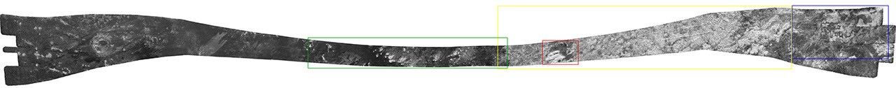 This swath maps terrain from about 25 degrees south latitude, 215 degrees west longitude to 30 degrees south latitude, 75 degrees west longitude, in a broad arc covering 6,500 kilometers (about 4,000 miles), and about 150 kilometers (95 miles) at the narrowest point. Illumination is from the north (top). The joints between individual radar beams are visible as long, straight lines that run across parts of the swath. They are not features on the Titan surface.