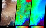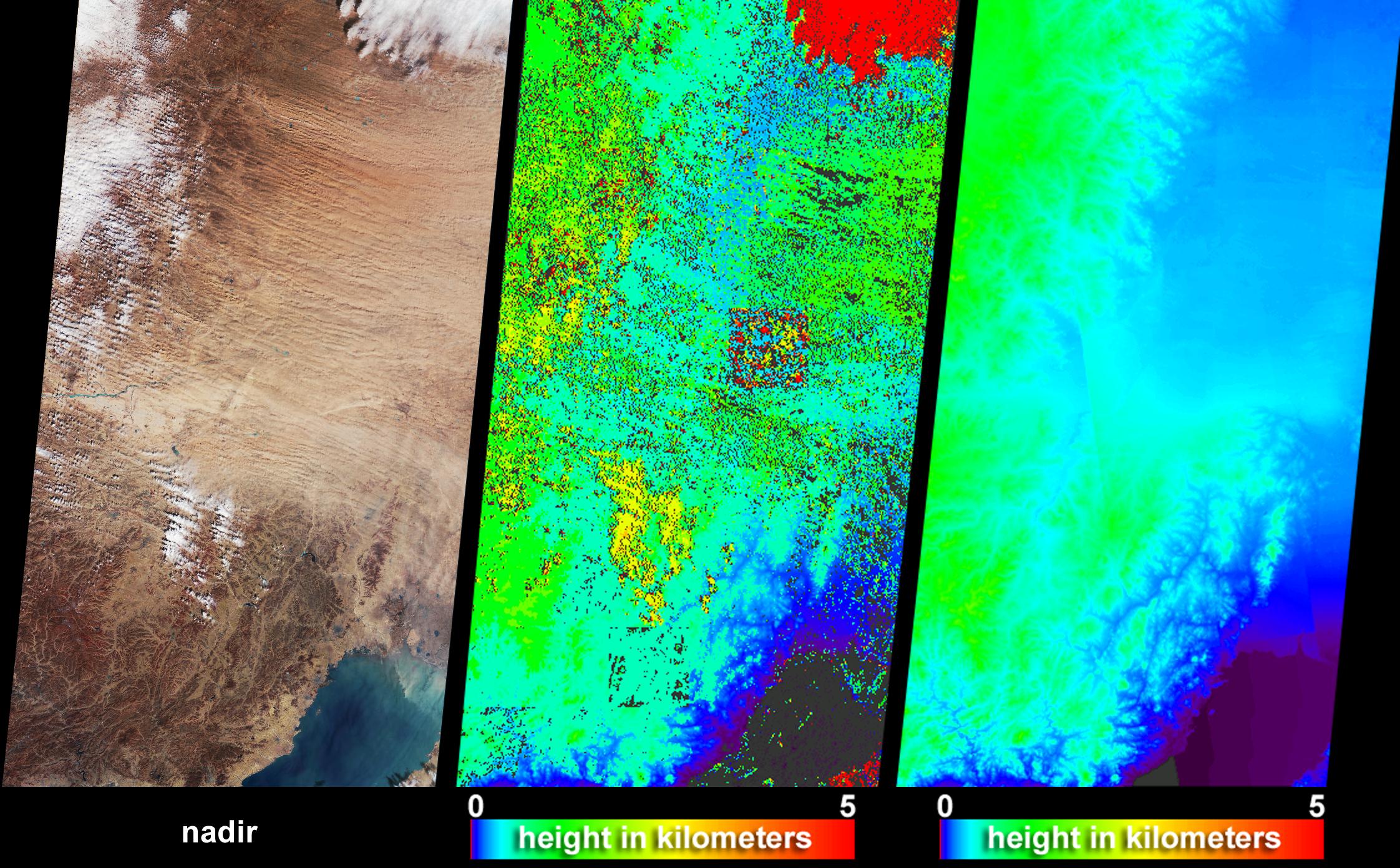 The Multi-angle Imaging SpectroRadiometer (MISR) captured these views of the dust and sand that swept over northeast China on March 10, 2004. Information on the height of the dust and an indication of the probable dust source region are provided by these images, which include a natural-color snapshot from MISR's nadir camera (left), a stereoscopically-retrieved height field (center) and a map of terrain elevation (right).