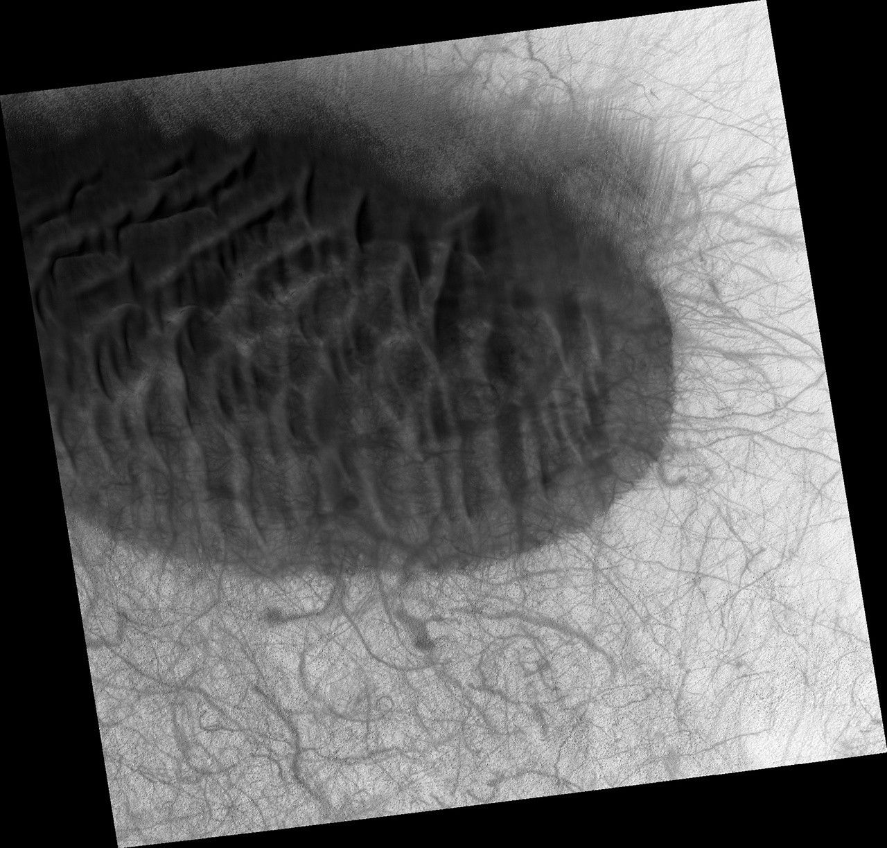 Dust devils form over the warm dunes but then dance out over the plains, spinning and performing pirouettes and leaving conspicuous dark tracks as bright dust is lifted from the surface. Loops in the tracks can often be used to discern the direction traveled by the dust devils, where in some cases, one track clearly overprints the other.