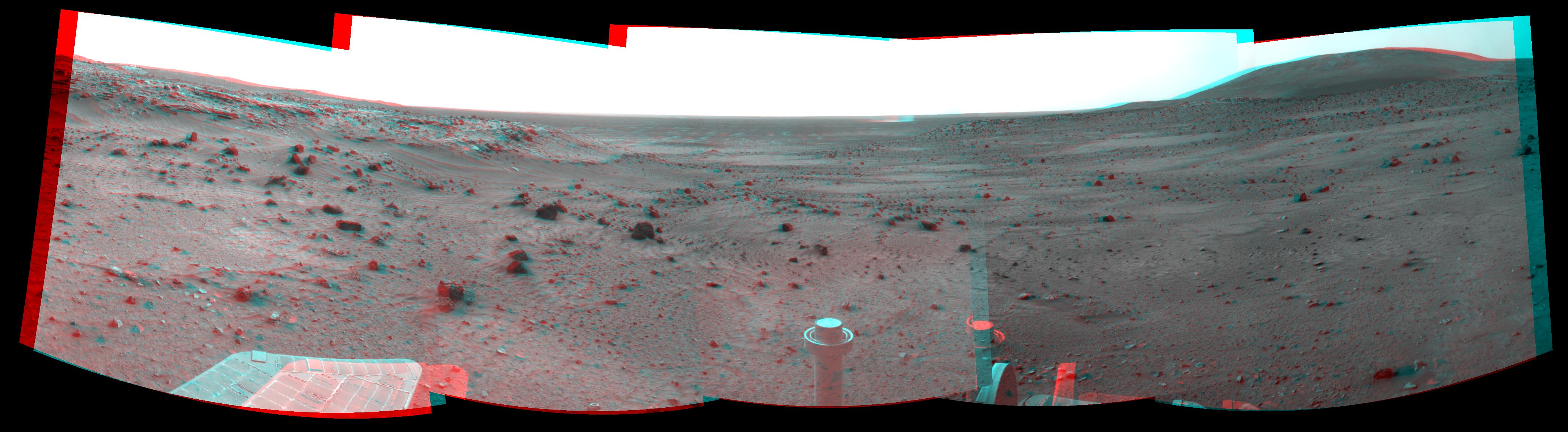 This view combines images from the left-eye and right-eye sides of the navigation camera. It appears three-dimensional when viewed through red-blue glasses with the red lens on the left.