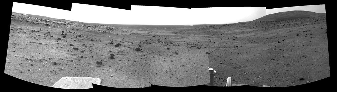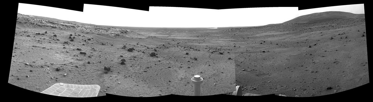 West is at the center, where a dust devil is visible in the distance. North on the right, where Husband Hill dominates the horizon; Spirit was on top of Husband Hill in September and October 2005. South is on the left, where lighter-toned rock lines the edge of the low plateau called "Home Plate."
