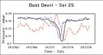 This figure shows the signature of a dust devil that passed over the Pathfinder Lander on Sol 25. Since then we have seen several similar features. The black line shows surface pressure plotted over a period of approximately two minutes. The sharp minimum approximately 0.5% below the background pressure is very clear. The dashed curves show raw data from two hot wire wind sensor elements (Blue = Wind Sensor 4 = East Wind, Red = Wind Sensor 1 = West Wind). When the wind blows directly on an element it cools. It is clear from the figure that the East wind increases suddenly as the dust devil approaches the lander and the pressure begins to fall. As the dust devil passes over the lander, pressure begins to rise, the East wind dies away and the West wind increases suddenly. Finally as the dust devil moves away, pressure returns to normal and the West wind dies away. This is a textbook dust-devil signature.