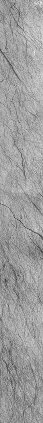 The fourth picture (above, right) shows a surface in southwestern Terra Sirenum near 63°S, 168°W, that has seen the activity of so many dust devils that it looks like a plate of dark gray spaghetti. This image, taken in early summer during February 2000, covers an area 3 km wide and 30 km long (1.9 by 19 miles). In fact, a dust devil can be seen in the upper right of this image. Like the other pictures shown here, the Terra Sirenum image is illuminated by sunlight from the upper left.