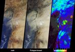 On October 18, 2002, a large dust plume extended across countries bordering the eastern Mediterranean Sea. Information on the horizontal and vertical extent of the dust are provided by these views from the Multi-angle Imaging SpectroRadiometer (MISR). The left-hand panel portrays the scene as viewed by the instrument's vertical-viewing (nadir) camera. Here only some of the dust over eastern Syria and southeastern Turkey can be discerned. The dust is much more obvious in the center panel, which is a view from MISR's most steeply forward-looking camera. In addition, this perspective makes shadows cast by clouds onto the dust layer more apparent, providing a visual clue that the dust is at a lower altitude than these clouds.